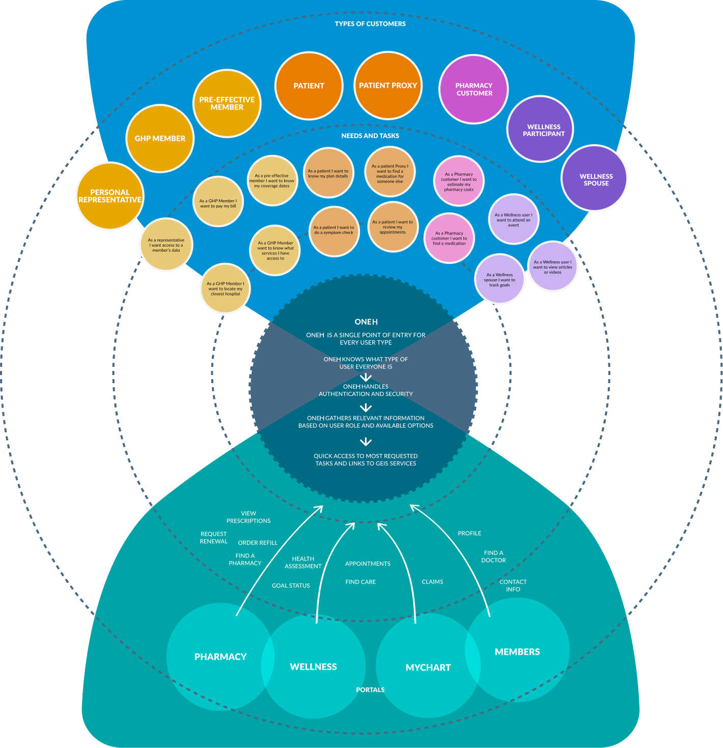 The lower half of the hourglass represents existing systems like Pharmacy, MyChart, Wellness, and Member portals, all connected through OneH. By integrating these services via role-aware routing, we created a streamlined, role-based experience that significantly reduced friction for users navigating Healthcare’s digital ecosystem.
